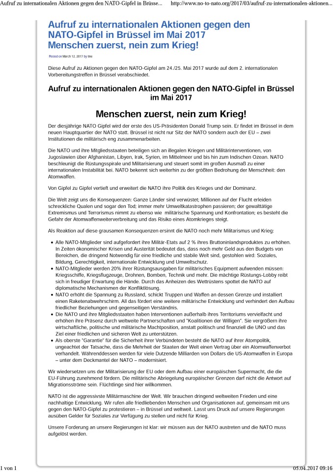 No to War - No to NATO - Aktion zum NATO Treffen in Brüssel 24-25. Mai 2017